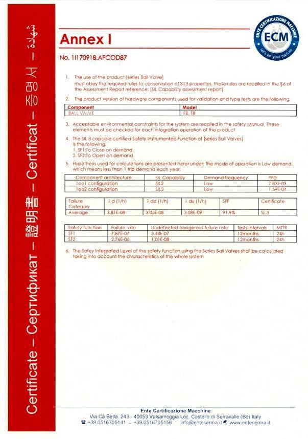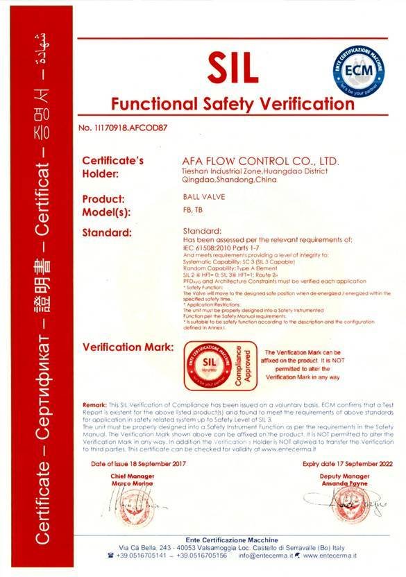As the safety awareness of all citizens continues to increase, people pay more and more attention to the quality and safety of products. For the field of fluid control, more emphasis is placed on the stable long-term operation and the safety and reliability of operation. In order to comply with the needs of the market, to improve the quality assurance of its metal seated ball valves and also to implement the company's always adhere to the customer-centered service tenet, Afa as early as 2017, strengthened internal management and improved Employee business skills, continuous upgrade of equipment, optimization of assessment methods, actively started the SIL3 certification of the valve actuator and passed the SIL3 certification of ECM in September 2017 and obtained the certification.