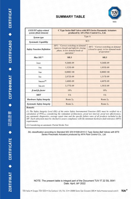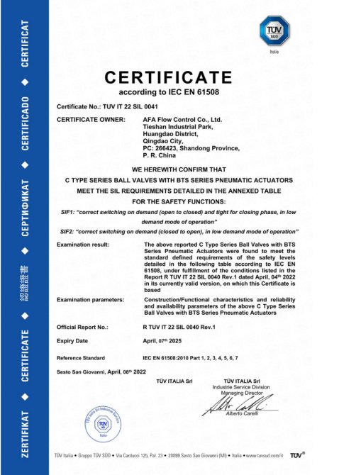 In order to further enhance the company's strength, continuously improve the company's social visibility and market competitiveness, and enhance the reliability and safety of the company's wear-resistant ball valve products, Afa Flow Control Co., Ltd. (hereinafter referred to as AFA) passed the audit inspection of TÜV SÜD experts for SIL3 functional safety certification at the end of 2021, and recently successfully obtained the SIL 3 product functional safety certification certificate issued by TÜV SÜD. This indicates that the company's products have reached the highest standards of product safety requirements in the petrochemical process production.