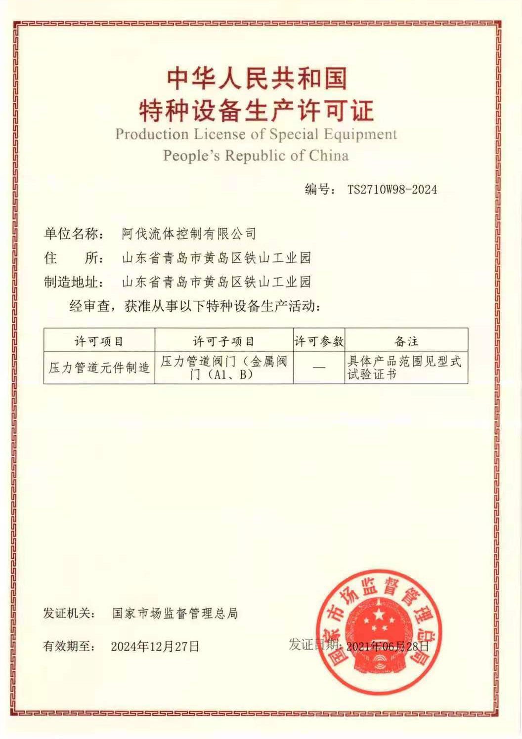 On July 5, 2021, the new special equipment manufacturing license (pressure piping components: metal valves (A1, B)) was sent to our company.